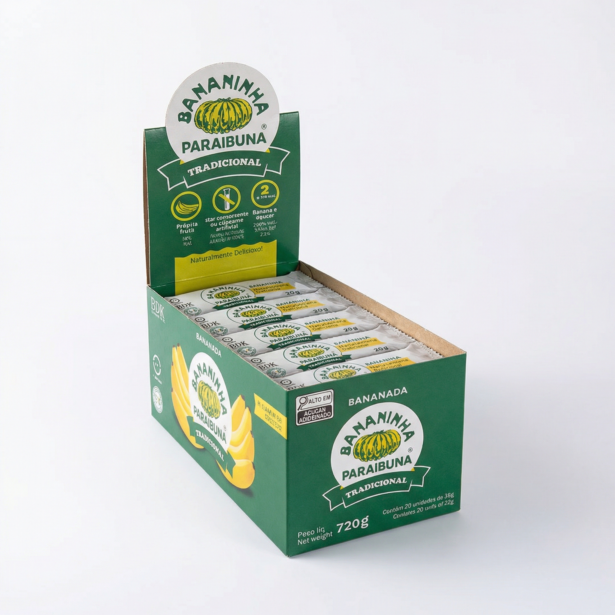 Display de 20 unidades individuales de Bananinha con azúcar. Cada unidad de 36g, ideal para punto de venta o para compartir.
